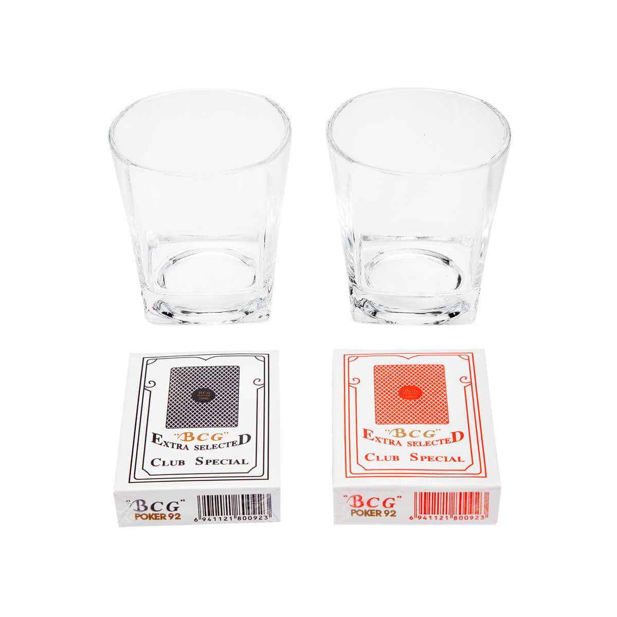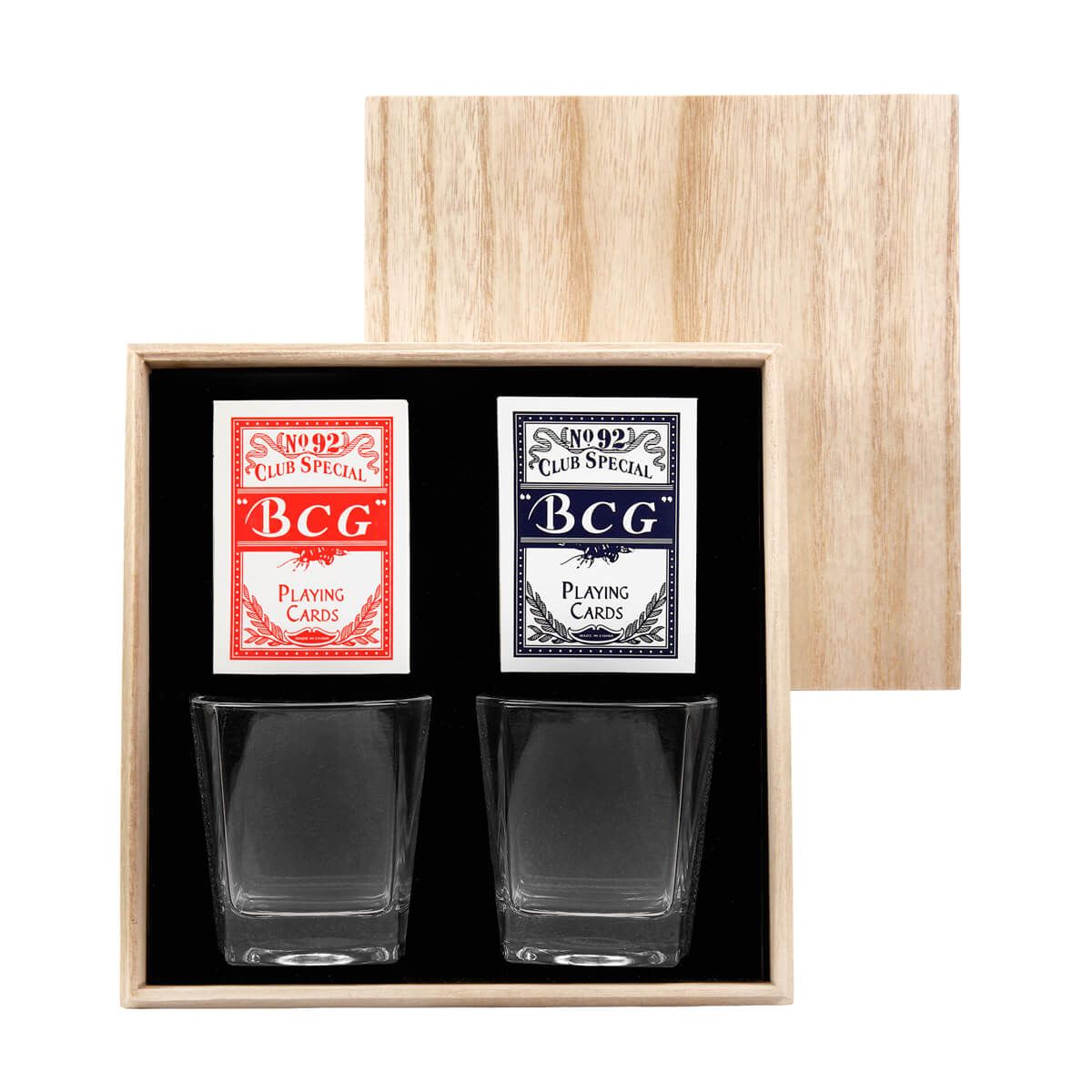 SET DE BAR BAROUK - Set de bar con 2 vasos whiskeros de cristal y 2 barajas para juego. Su presentación lo hace perfecto para ocasiones especiales, desde celebraciones personales hasta un obsequio corporativo. Incluye estuche de madera.