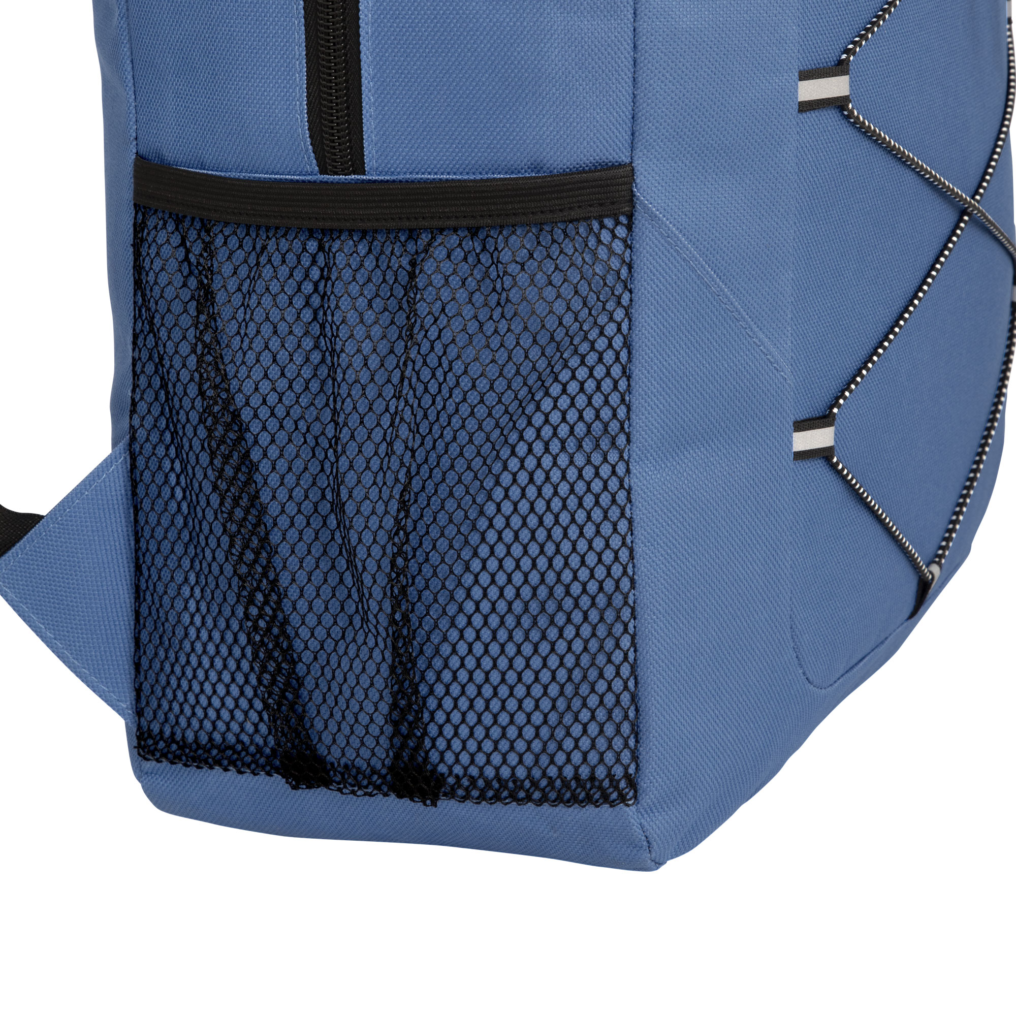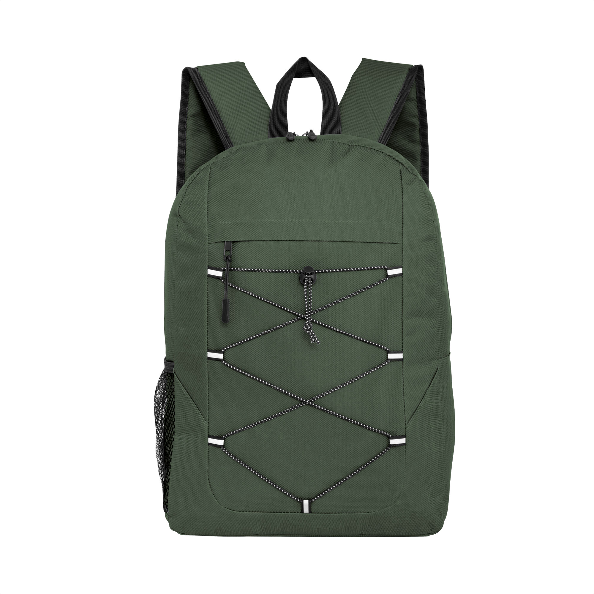 Mochila "TRIP" Mochila outdoor. Compartimento principal con doble cierre. Bolsillo frontal con cierre, cordón elástico cruzado ajustable y un bolsillo de red lateral para transportar botellas. Detalles reflectivos. Cierres metálicos con tiradores de goma. Correas regulables y espalda acolchadas