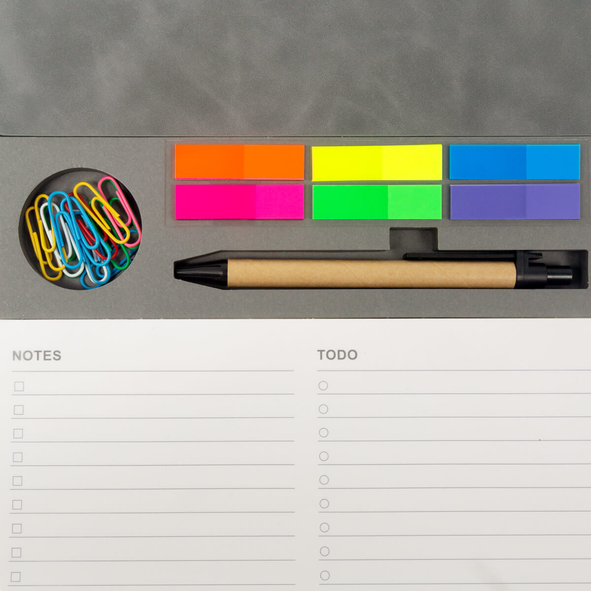 PORTA NOTAS KALEM - Porta notas de curpiel con sistema plegable que se convierte en soporte para smartphone y organizador de bolígrafos. Incluye un bolígrafo ecológico, 9 clips metálicos y block con 80 notas. Ideal para mantener todo a la mano en escritorio o reuniones.