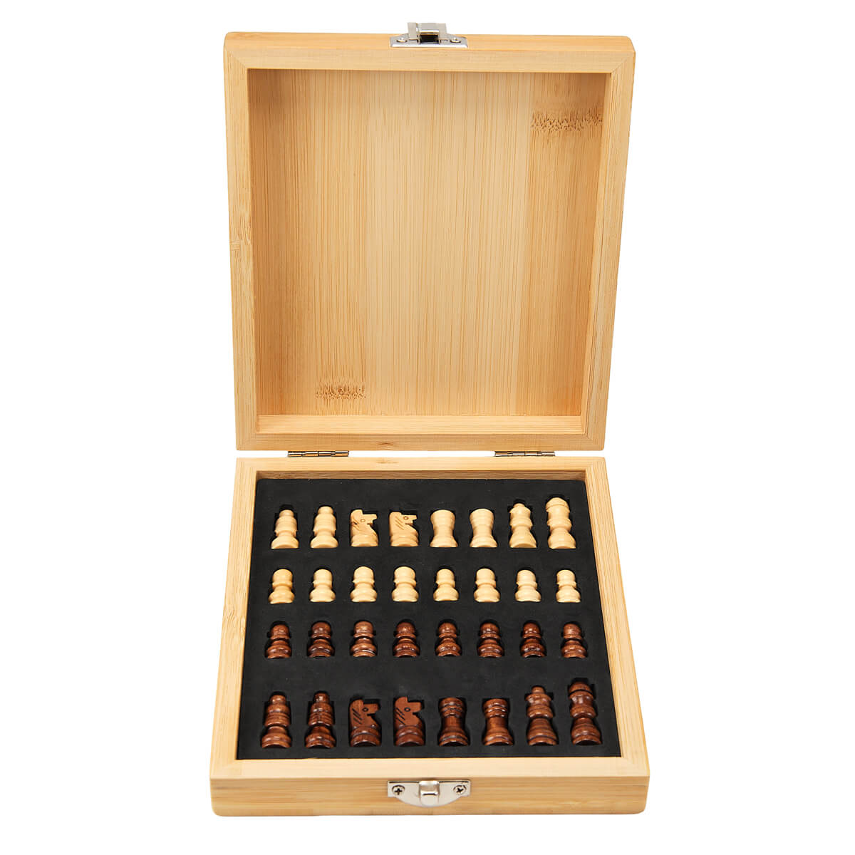 AJEDREZ HAKO - Fabricado en bambú, ideal para los amantes del juego estratégico que valoran la practicidad y el diseño. Incluye 32 piezas en dos tonos de madera (oscuro y claro), perfectamente proporcionadas y almacenables dentro de su propio estuche. El tablero está impreso directamente sobre la tapa del estuche, lo que permite jugar cómodamente y guardar todo con facilidad. Su broche metálico garantiza seguridad durante el transporte. La madera es un producto natural el cual puede presentar variaciones en tonalidades y vetas. Incluye caja Individual.