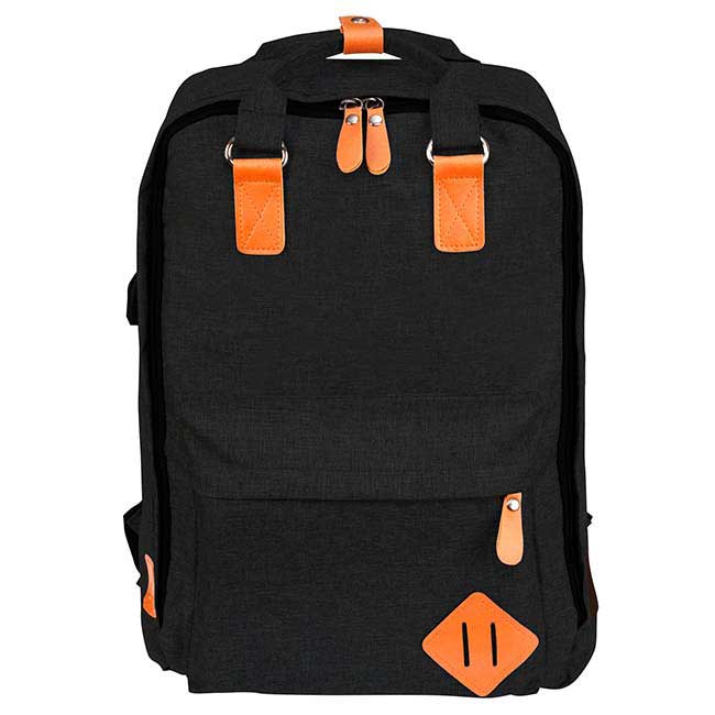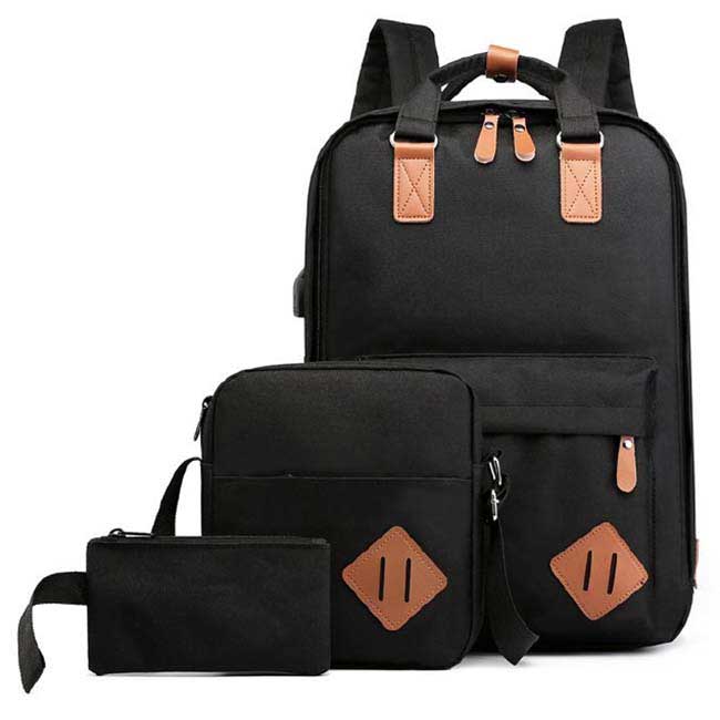 Set maletines Gordon Incluye Backpack, bolsa correa larga y bolsillo de mano. Backpack con salida para usb y audífonos. Amplio bolsillo frontal. Compartimiento inferior para laptop. Color: Negro