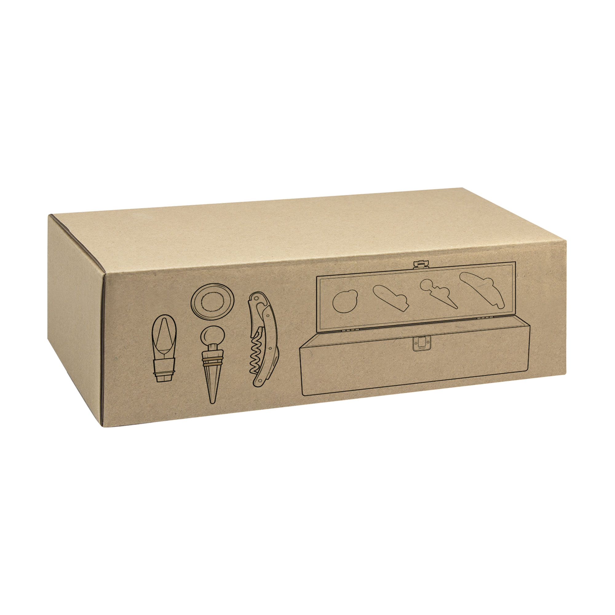 Set de vino "VINICIUS" Set de vino. Caja de bambú portabotellas con cierre metálico. Bandeja de eva con set de 4 accesorios: sacacorchos, anillo antigoteo, tapón y vertedor