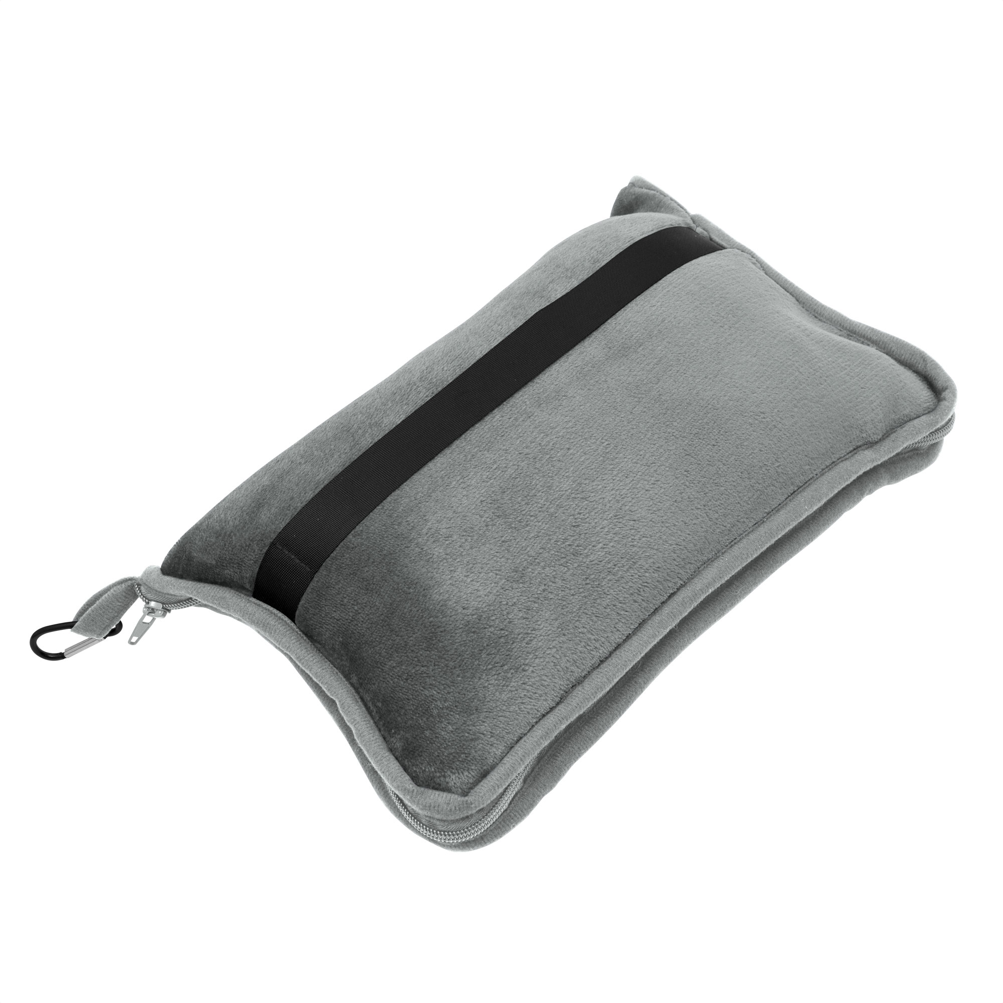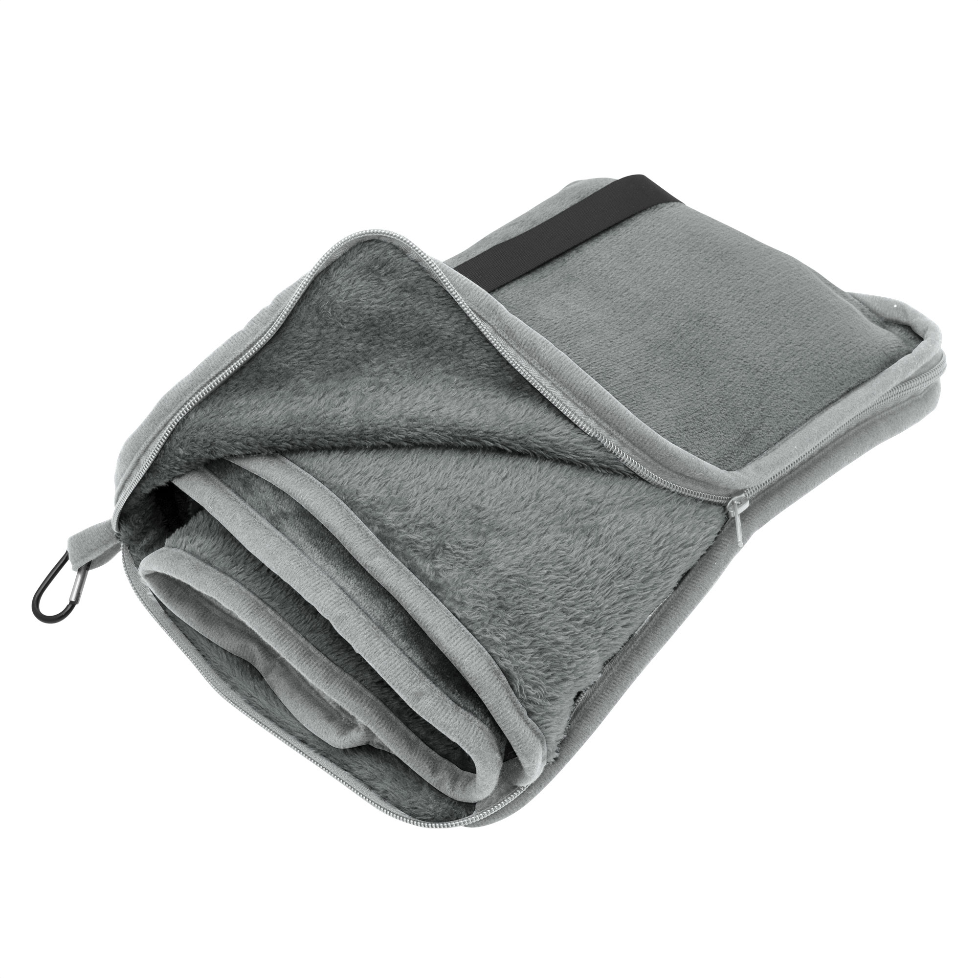 Manta y almohada de viaje "TEDDY" Manta y almohada de viaje compacta 2 en 1. Manta de polar de alta calidad con textura aterciopelada al tacto. Doble felpa, de pelo corto y largo. Funda con cierre del mismo material, con mosquetón para colgar en mochila y tira para sujetar la mochila en la manija extensible de un equipaje de mano. Cuando la manta está plegada y dentro de la funda se puede utilizar como almohada
