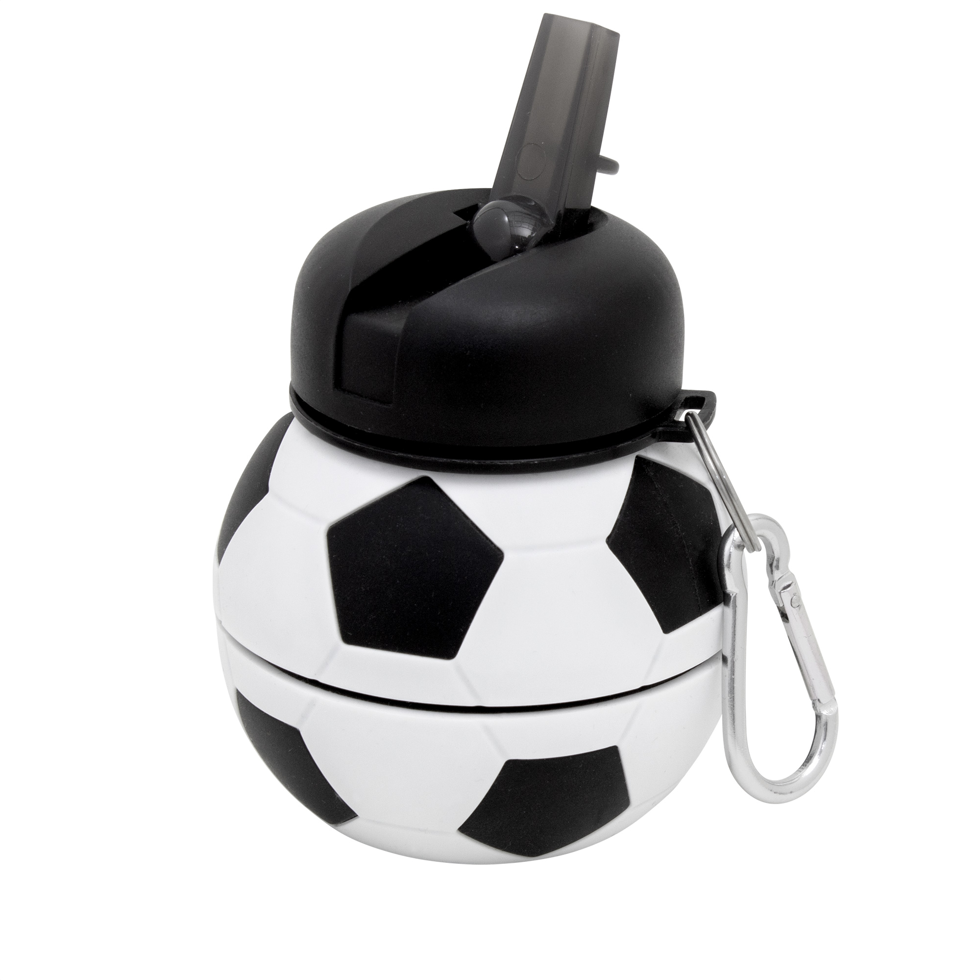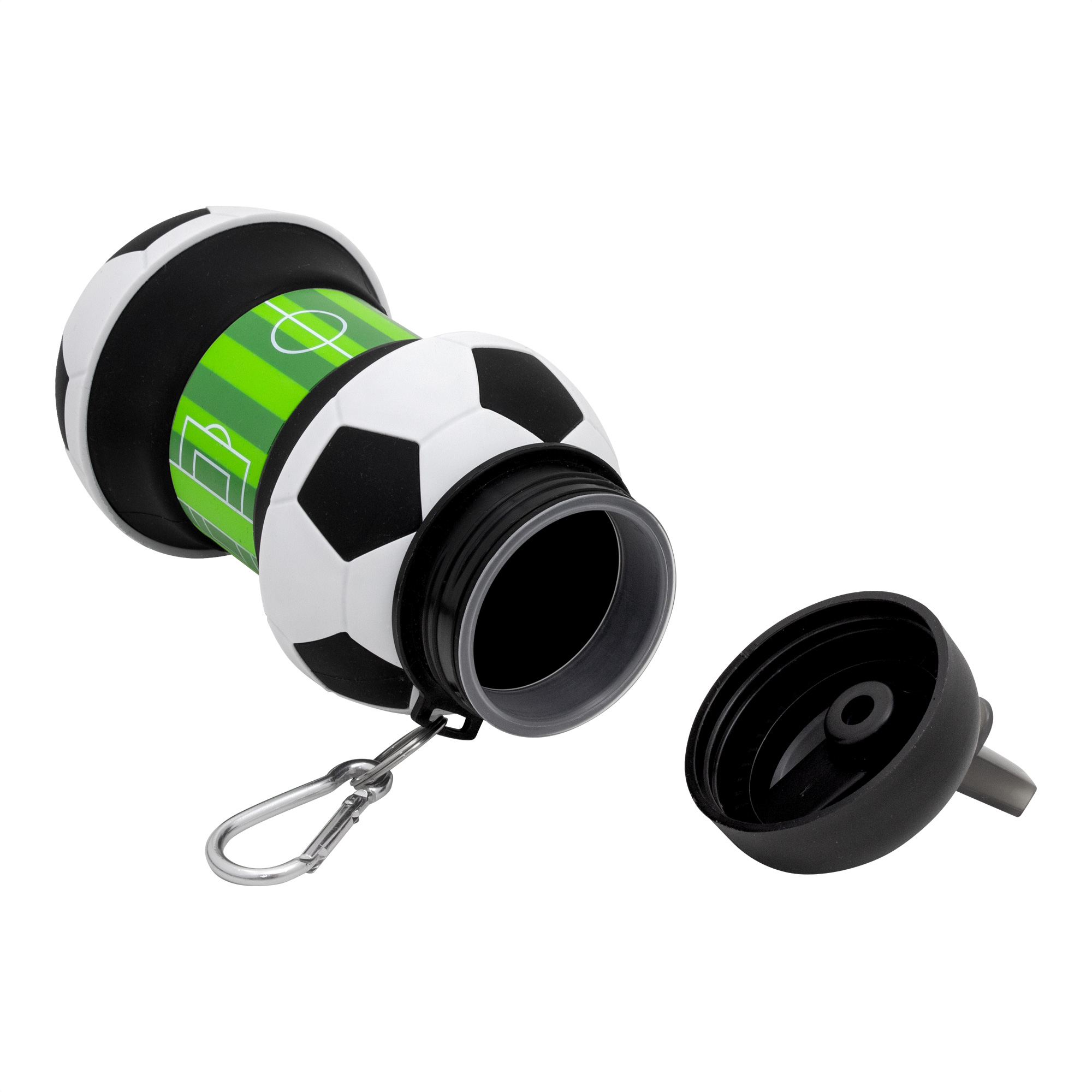 Botella plegable "PITCH" Botella plegable con forma de pelota de fútbol. Al desplegarse se descubre la imagen de un campo de juego. Tapa plástica con boquilla y seguro antivuelco. Mosquetón de aluminio plateado. Para ajustar el tamaño de la botella, simplemente despliega la boquilla y ajusta la altura según tus necesidades