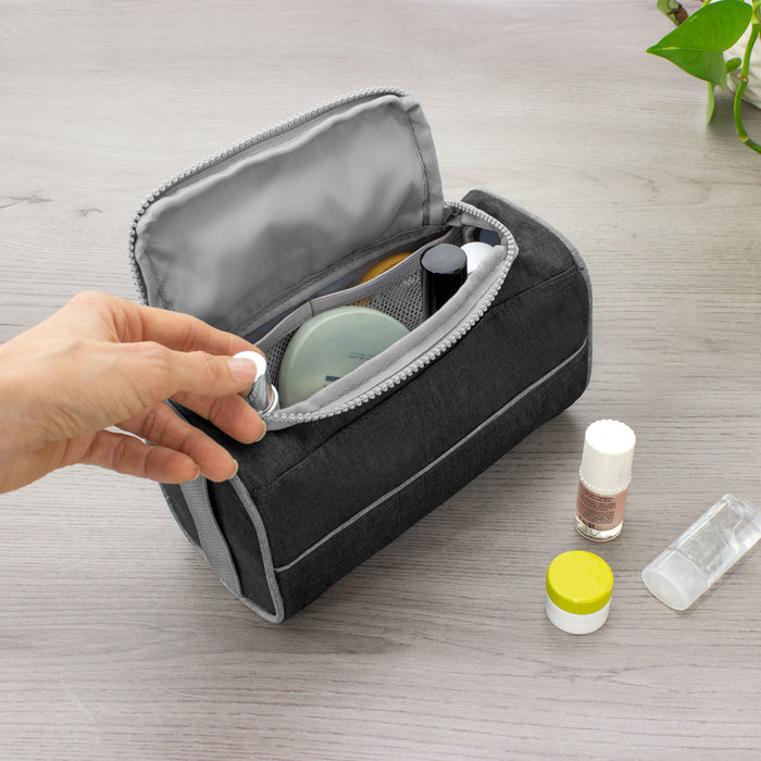 Necessaire "PRESTON" Necessaire con tapa. Organizador con dos bolsillos internos de red elastizados, tapa acolchada con cierre plástico color gris y asa lateral de tela color gris para transportar