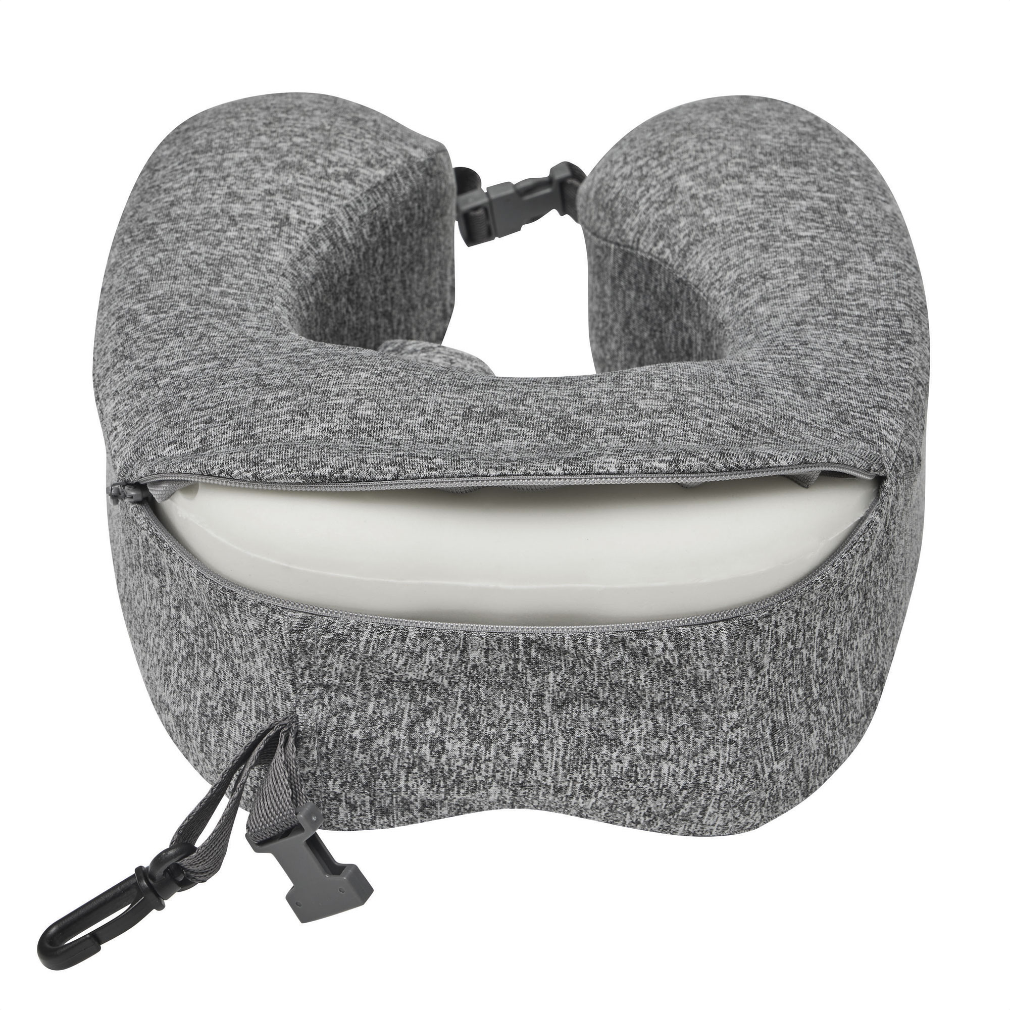 Almohada de viaje "REM" Almohada cervical. Funda extraible con cierre metálico y capucha incluida. Correas con cierre a presión y mosquetón plásticos para optimizar el guardado y traslado