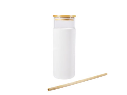 Vaso de vidrio con protector de silicona, tapa de bambú con orificio para popote.