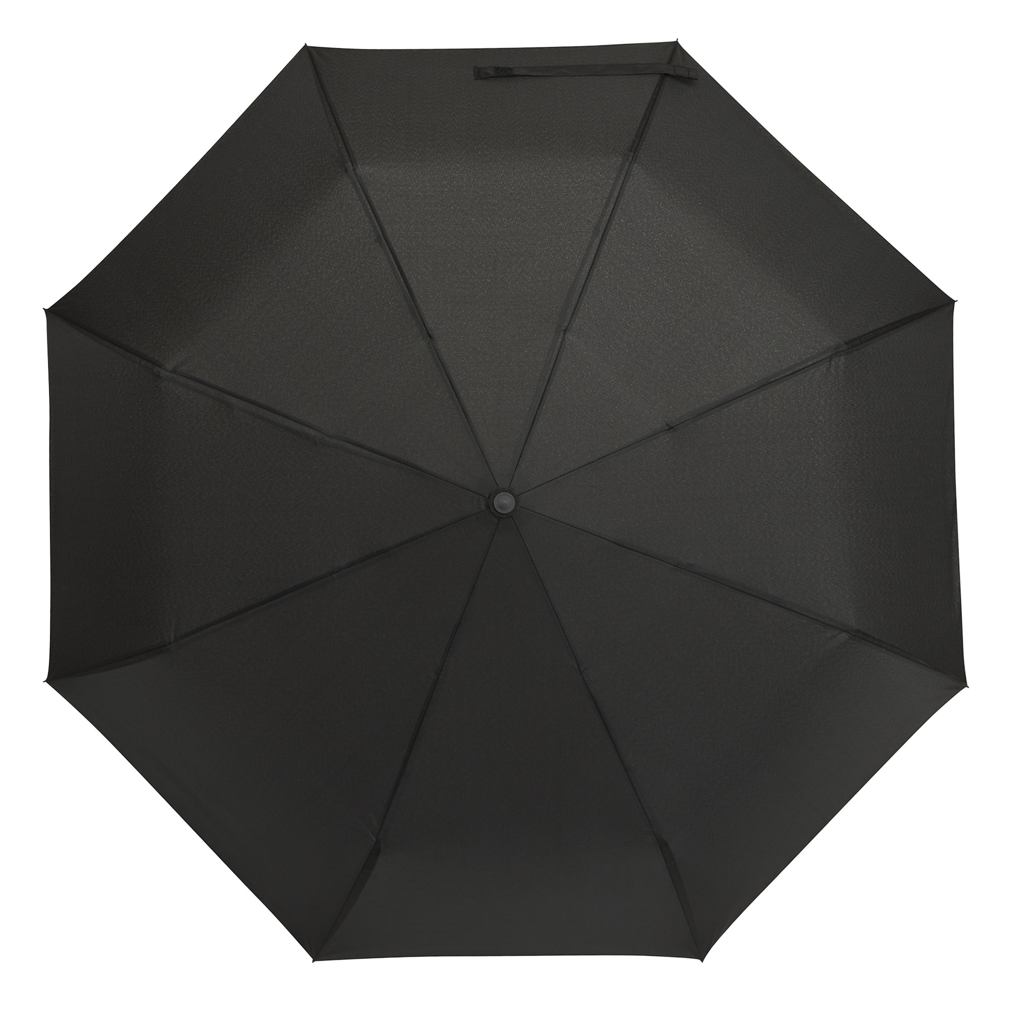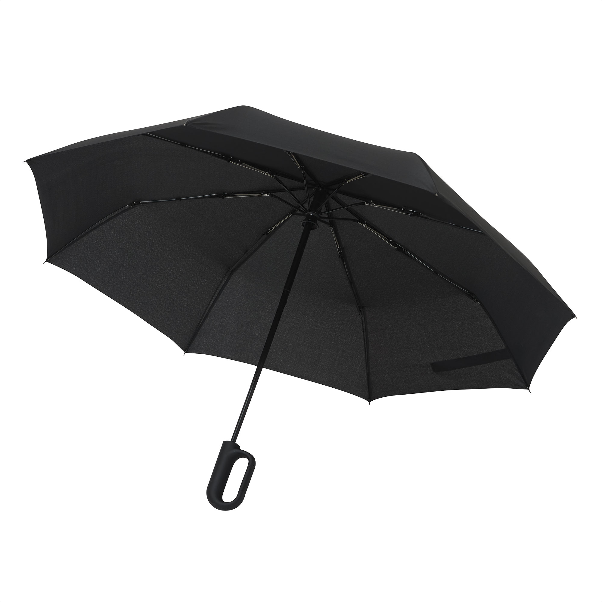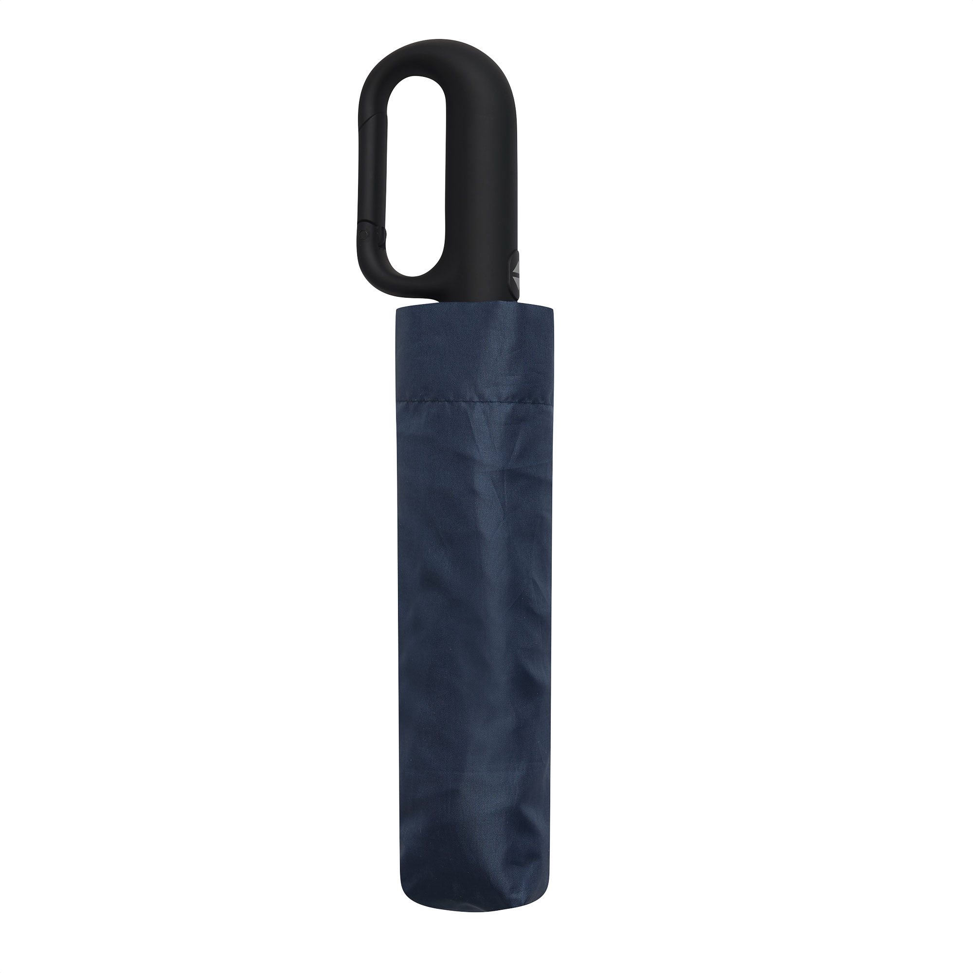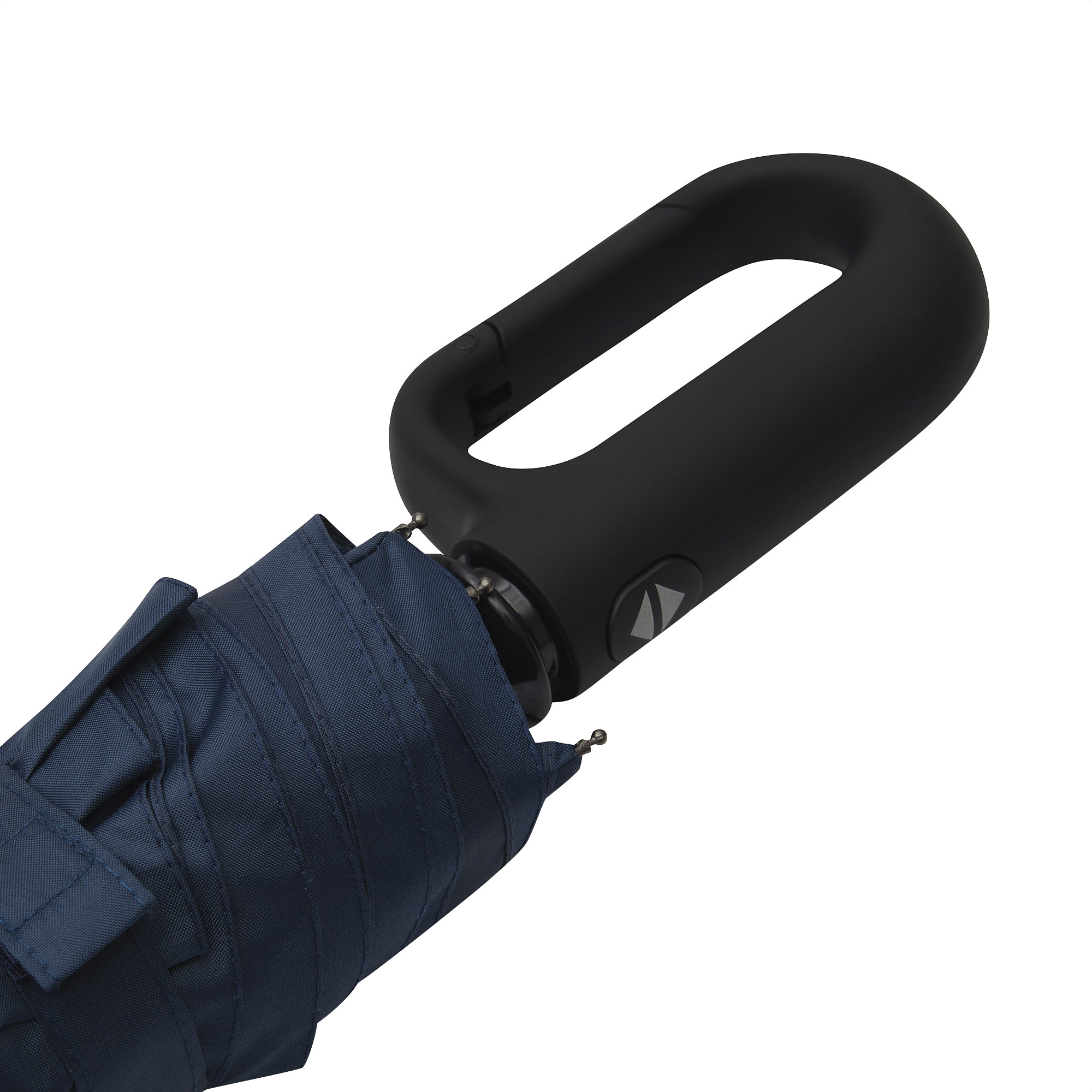 Paraguas "MOSK" Paraguas APERTURA Y CIERRE AUTOMATICO. Eje y varillas metálicas. Mango con asa y sistema mosquetón, de plástico engomado color negro mate. Botón a presión. Cierre con correa de velcro