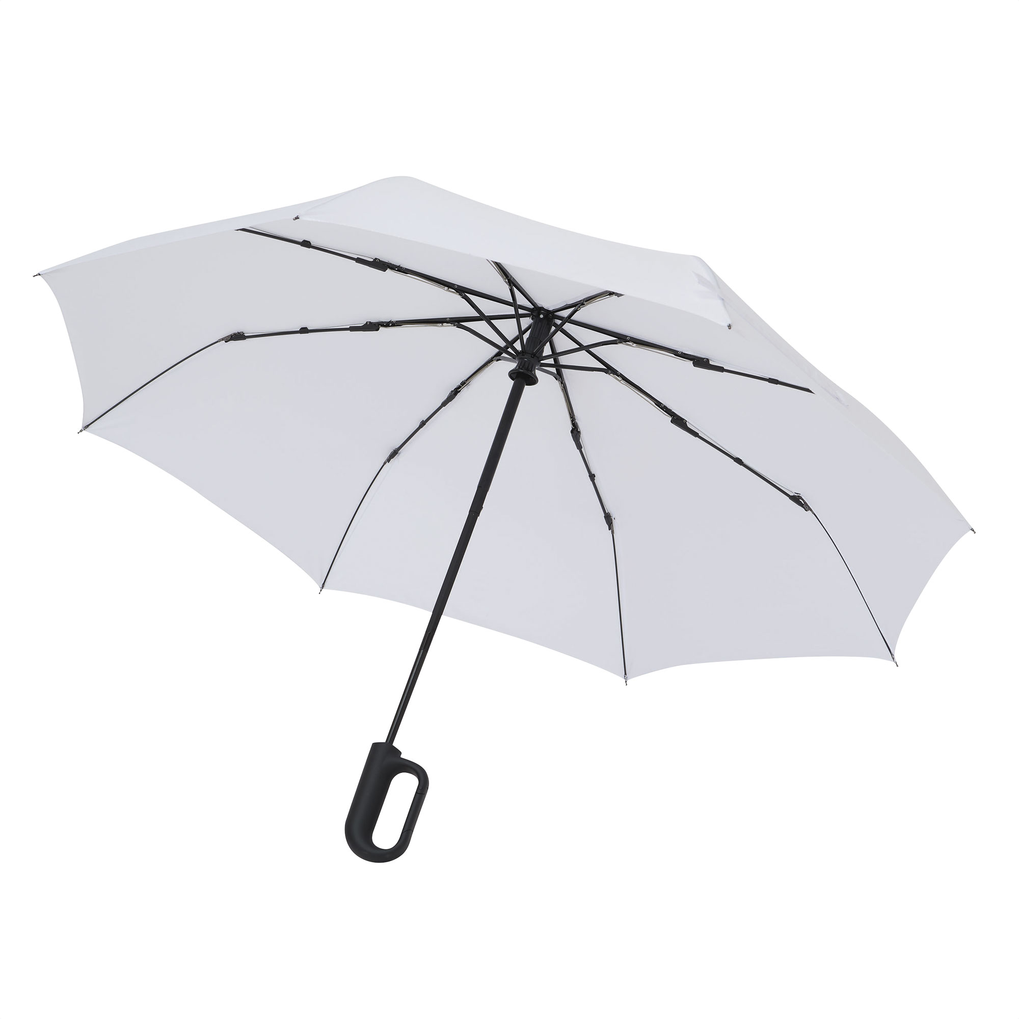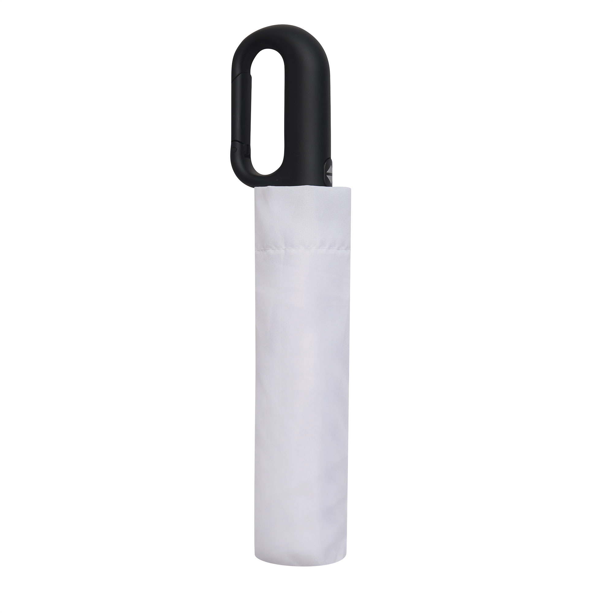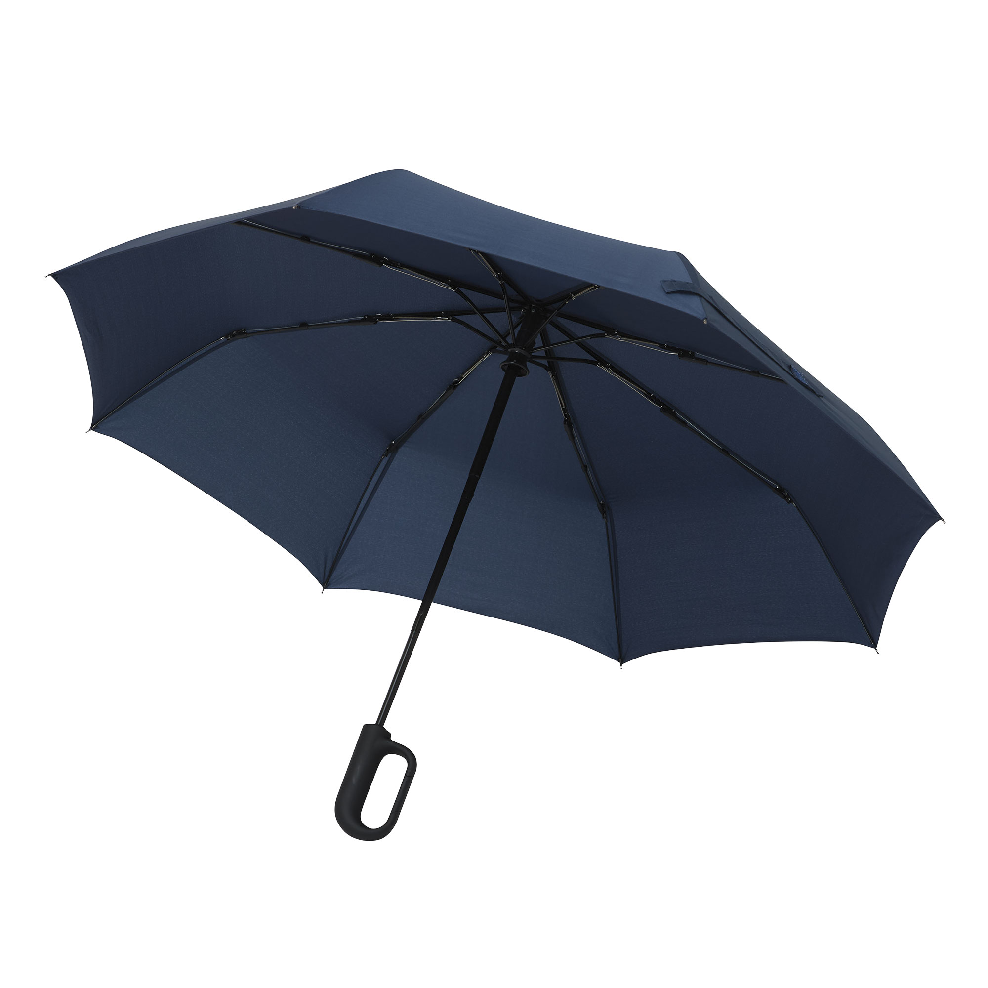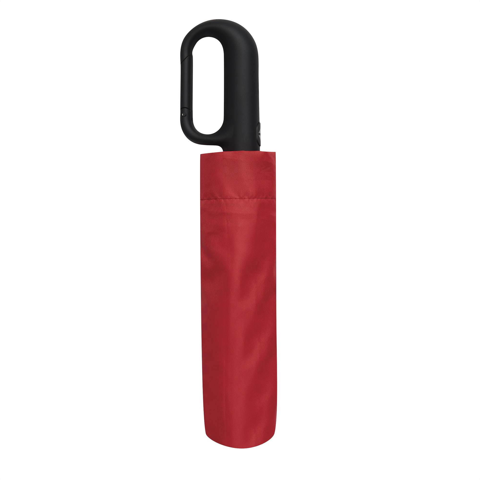 Paraguas "MOSK" Paraguas APERTURA Y CIERRE AUTOMATICO. Eje y varillas metálicas. Mango con asa y sistema mosquetón, de plástico engomado color negro mate. Botón a presión. Cierre con correa de velcro