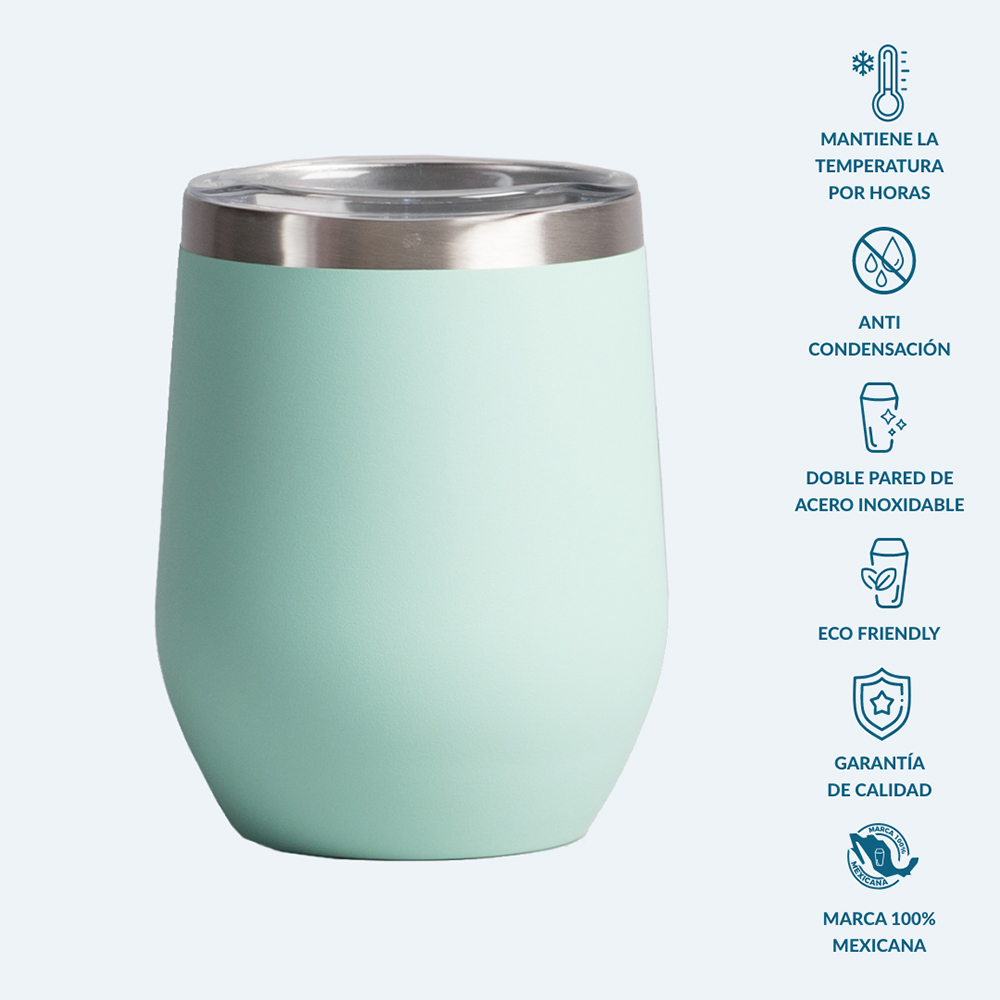 Vaso para vino fabricado con acero inoxidable de grado cocina libre de BPA, cuenta con una doble pared grado 18/8 anti condensación, la cual permite mantener la temperatura ideal de tu bebida hasta el último trago, aislando el calor y el frío del ambiente. Su composición de alta calidad lo vuelve resistente a la perforación y corrosión, brindado un producto de alta durabilidad. Producto de fácil lavado, permitido en lavavajillas. Capacidad 355 ml.