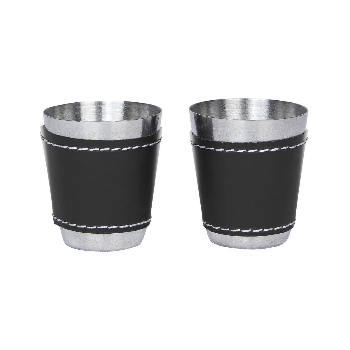 LICORERA BRISTOL - Set de licorera con tapa de rosca para evitar derrames, 2 vasos metálicos con manga de curpiel, 1 embudo y caja de regalo.