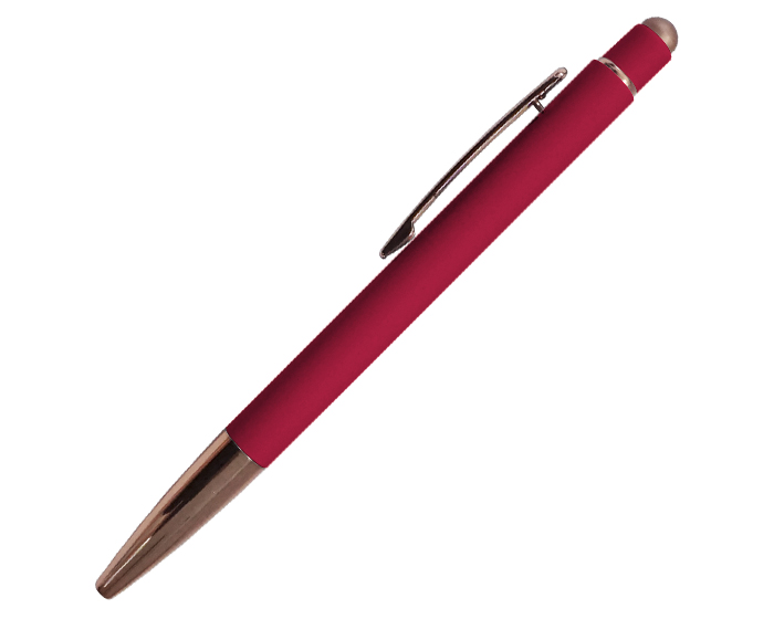LEIA - Bolígrafo metálico de tinta negra alemana de 1.0 mm., con acabado de goma, suave al tacto; con punta y touch con terminado brillante en color oro rosa. Mecanismo de click.