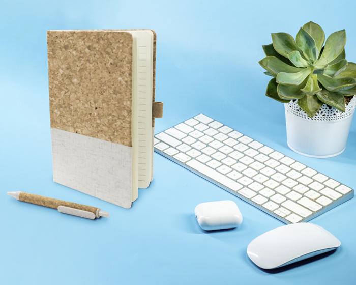 MATERIAL: Corcho, algodón y papel / Bolígrafo: corcho y fibra de trigo. MEDIDAS: 14 x 21 x 1.4 cm IMPRESION: SE DTFT MED. EMPAQUE: 40 x 38 x 25 cm PESO EMPAQUE: 13.5 kg PIEZAS EMPAQUE: 50