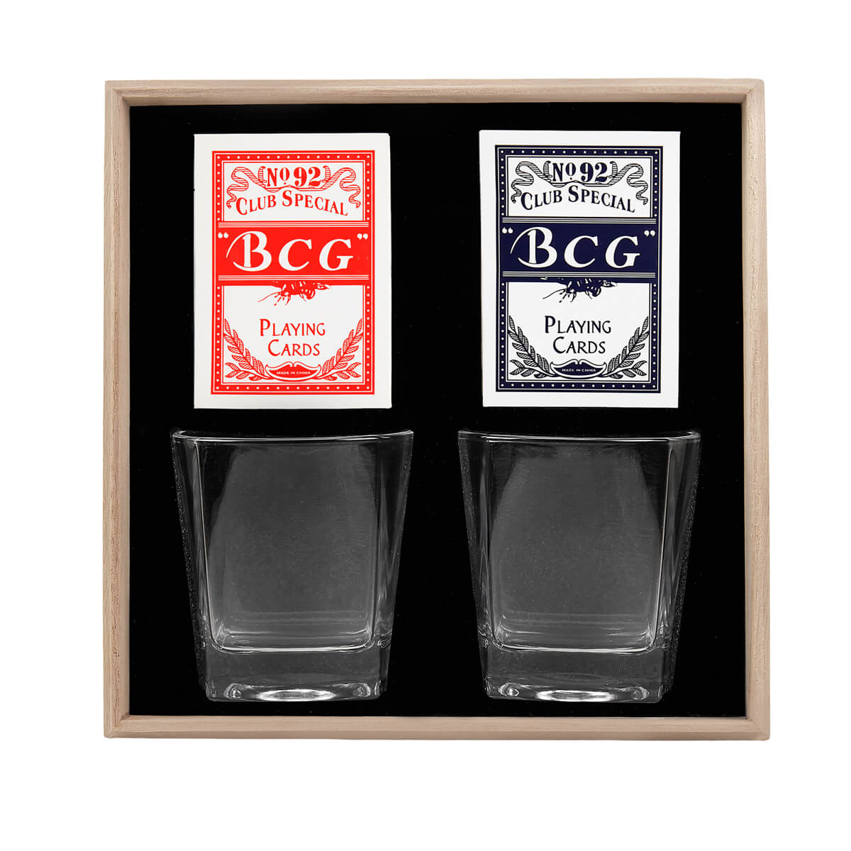 SET DE BAR BAROUK - Set de bar con 2 vasos whiskeros de cristal y 2 barajas para juego. Su presentación lo hace perfecto para ocasiones especiales, desde celebraciones personales hasta un obsequio corporativo. Incluye estuche de madera.