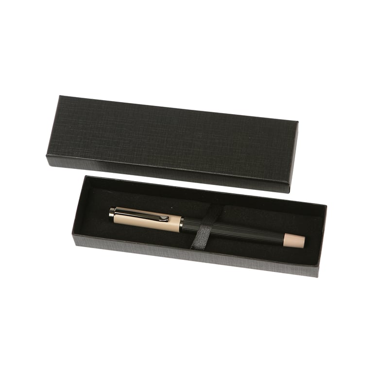 Bolígrafo Enfield. - Bolígrafo con barril fabricado en acero inoxidable, con detalles en color plateado, tipo roller. Tinta de escritura de gel color negro. Incluye caja de regalo color negro.