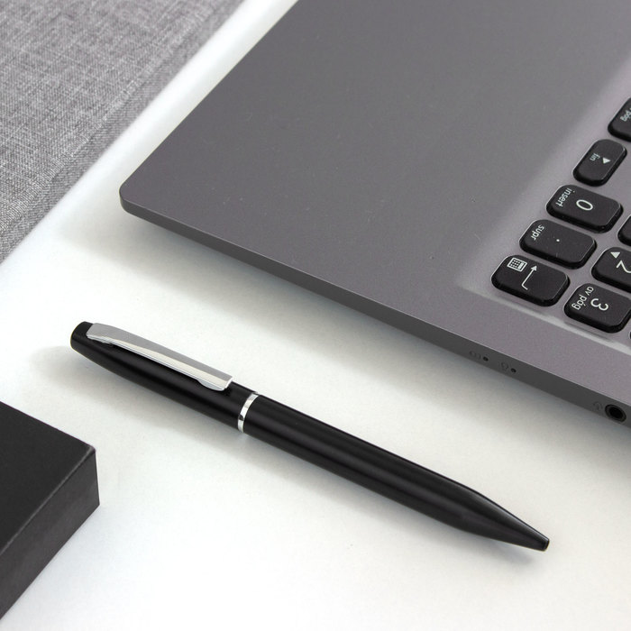 Bolígrafo "MORK" Bolígrafo con apertura giratoria. Cuerpo metálico en negro mate. Cuerpo de aluminio reciclado. Destape electroplateado en la parte superior. Recarga metálica. Clip y anillos metálicos color plata.