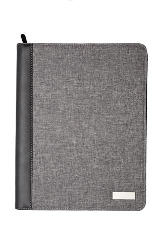 CARPETA "STYLUS II" Carpeta con cierre. Exterior acojinado. Plaqueta metálica para grabado (Medida: 5x2 cm). Interior: Compartimento porta tablet, tarjetero, calculadora y 3 portabolígrafos elásticos. Incluye bloc blanco Tamaño A-4 20 hojas