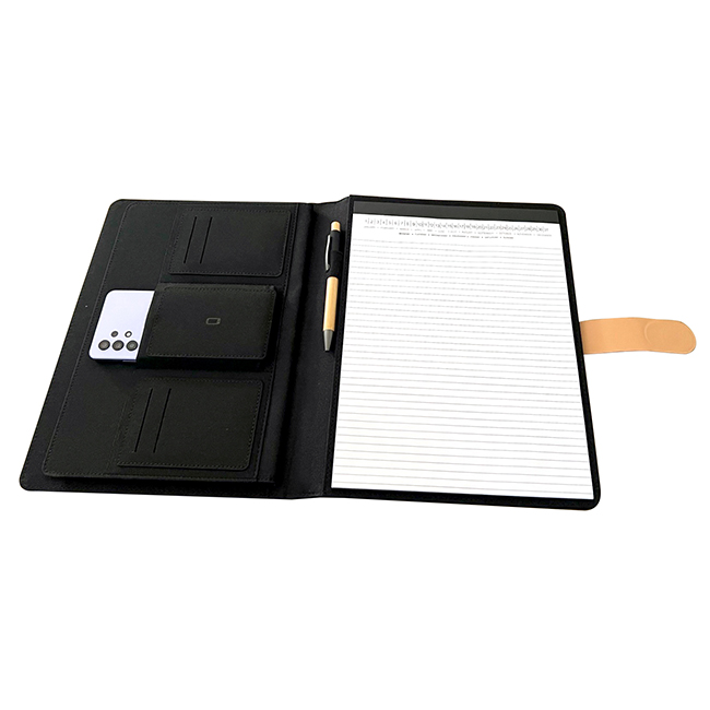 Porta Documentos Tokio • Incluye block de hojas rayadas.• Interior con portabolígrafos y compartimentos organizadores.• Cierre magnético con presilla.• Fabricado en PET reciclado.Material: PET recicladoMedidas: 31 × 23 cmÁrea de impresión: 10 × 4 cmImpresión: Full Color, Láser, Serigrafía