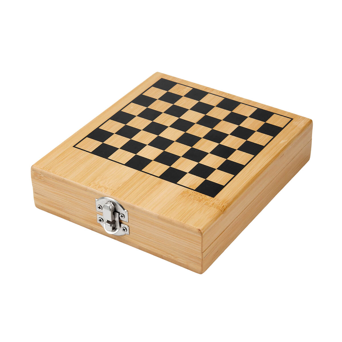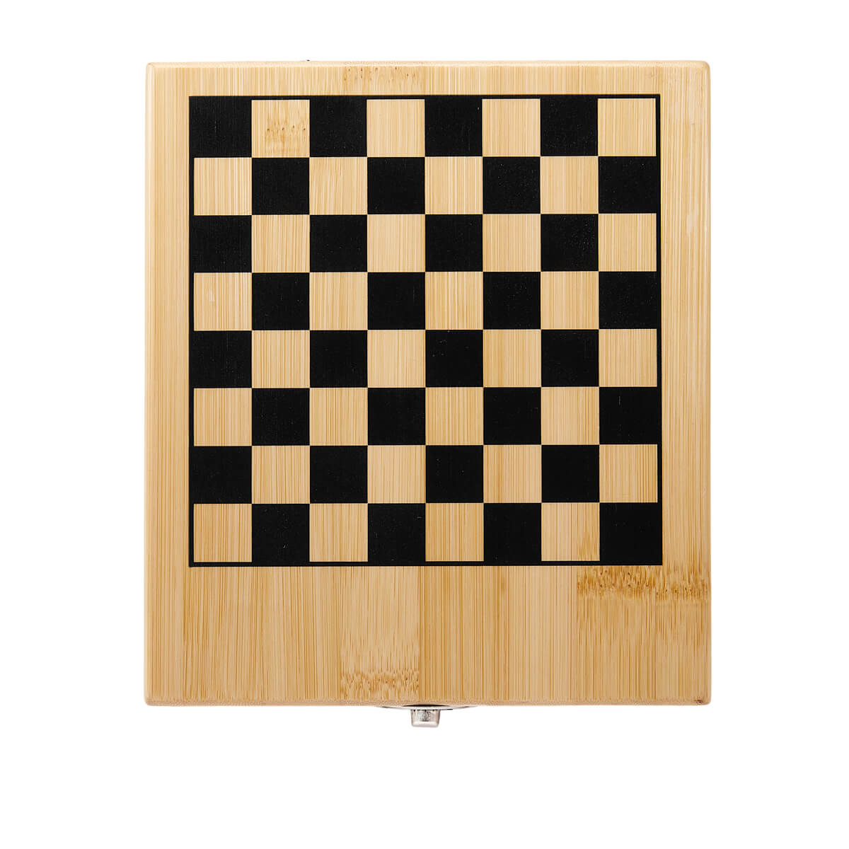 AJEDREZ HAKO - Fabricado en bambú, ideal para los amantes del juego estratégico que valoran la practicidad y el diseño. Incluye 32 piezas en dos tonos de madera (oscuro y claro), perfectamente proporcionadas y almacenables dentro de su propio estuche. El tablero está impreso directamente sobre la tapa del estuche, lo que permite jugar cómodamente y guardar todo con facilidad. Su broche metálico garantiza seguridad durante el transporte. La madera es un producto natural el cual puede presentar variaciones en tonalidades y vetas. Incluye caja Individual.
