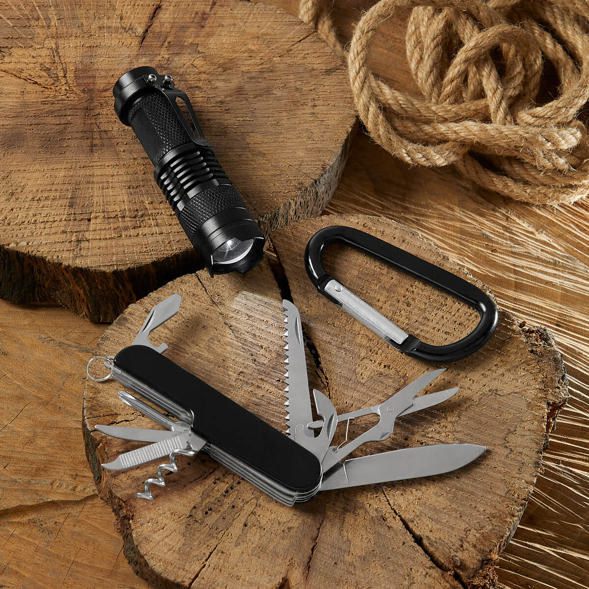 SET NERKA - Set de herramientas multiusos. Incluye gancho metálico, lámpara con luz ajustable y navaja con 9 funciones: (navaja, sierra, tijeras, destapador, abrelatas, sacacorchos, guía de hilo, lima y desarmador de cruz). Incluye caja individual.