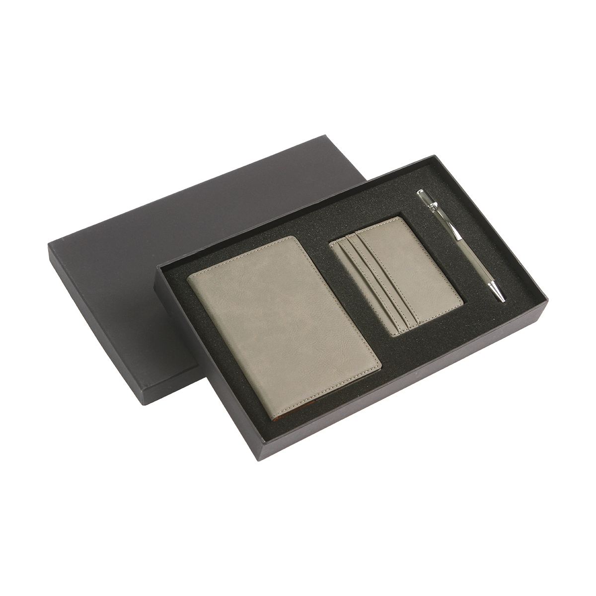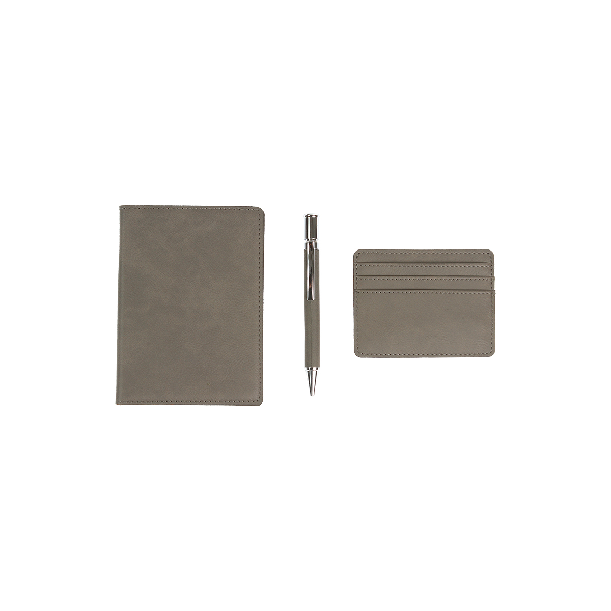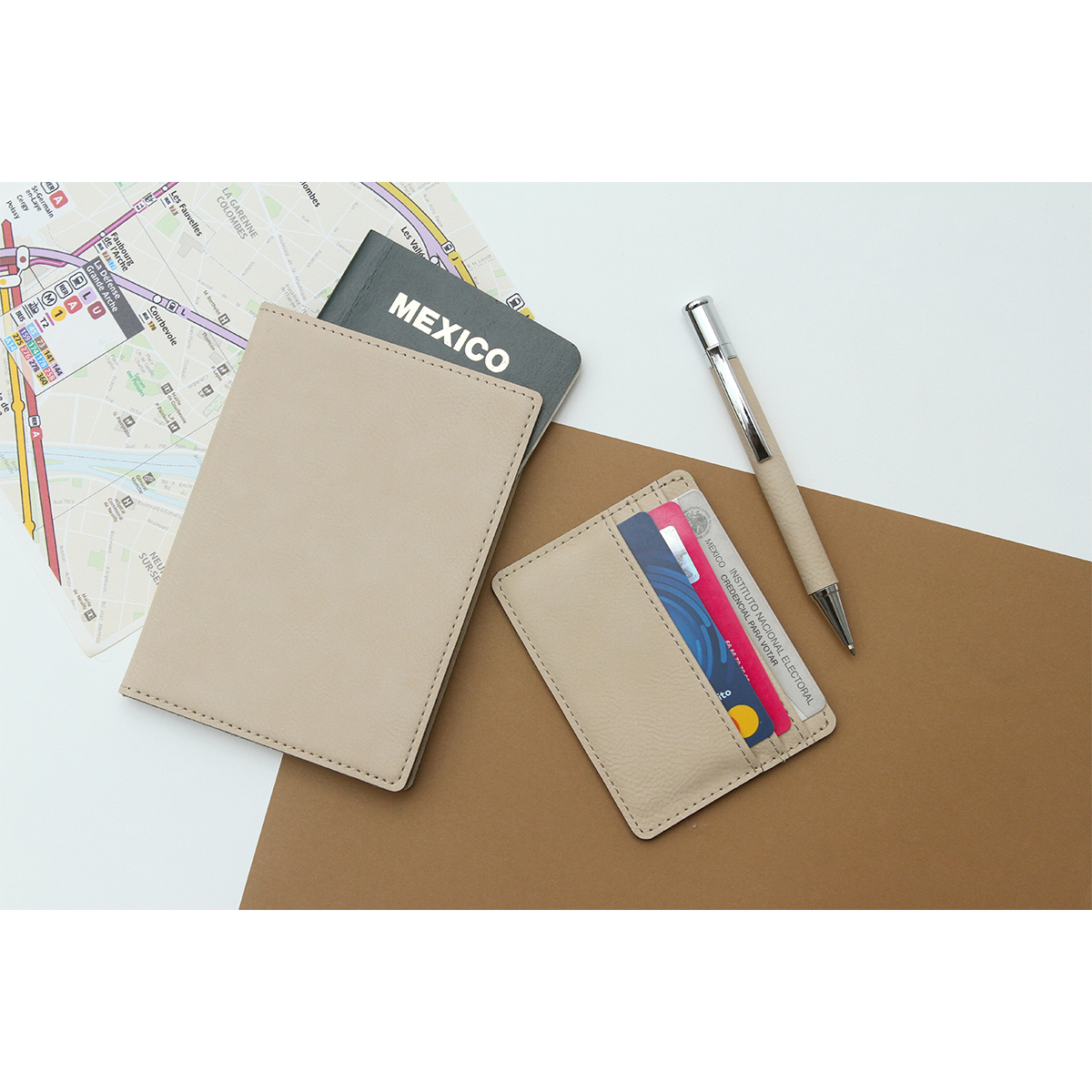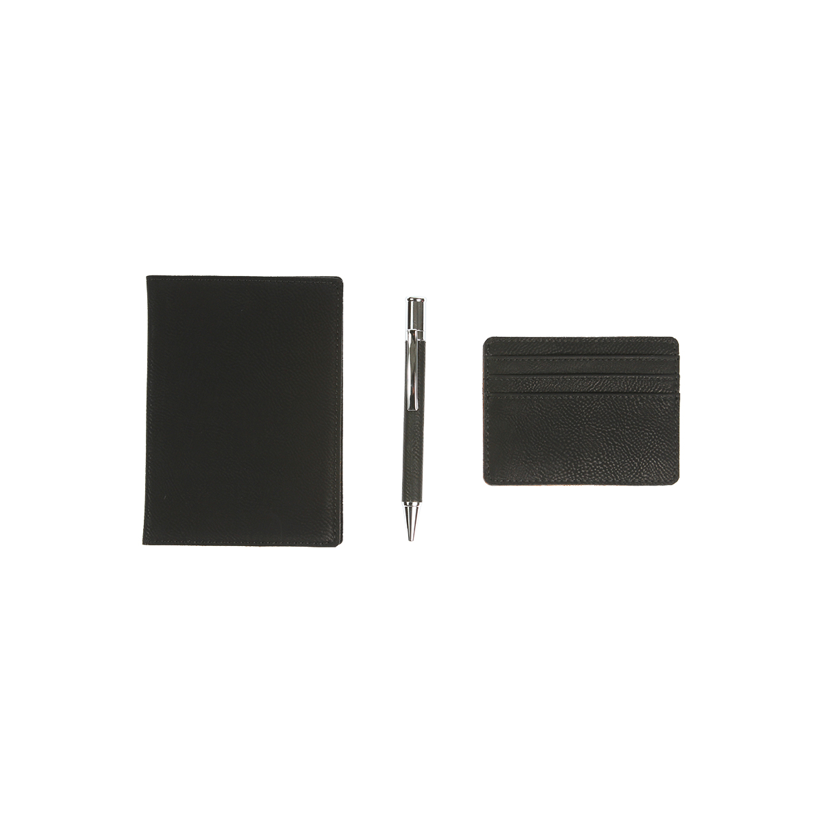 MEDIDAS: Porta pasaporte: 14x10.5x0.6 cm. | Bolígrafo: 13x1 cm. | Tarjetero: 10x7x0.3 cm. MED. EMPAQUE: 62x40x44 PIEZAS EMPAQUE: 40