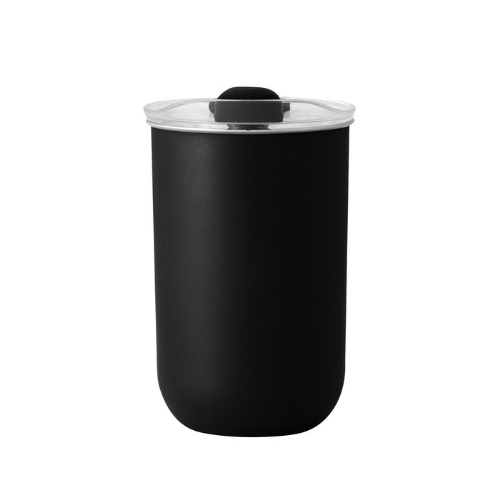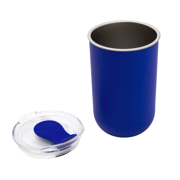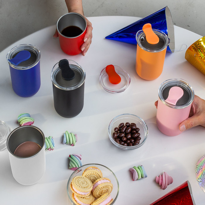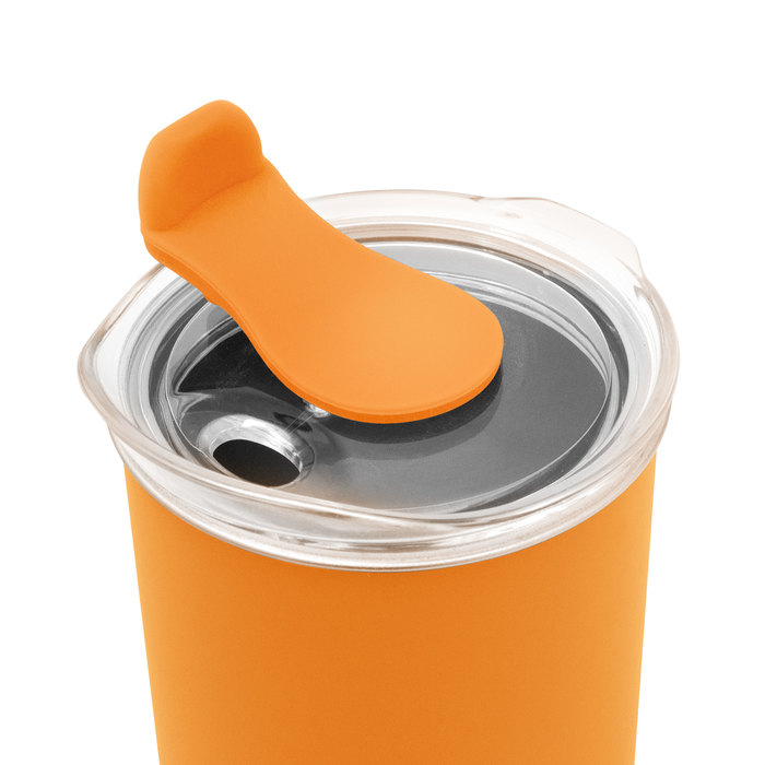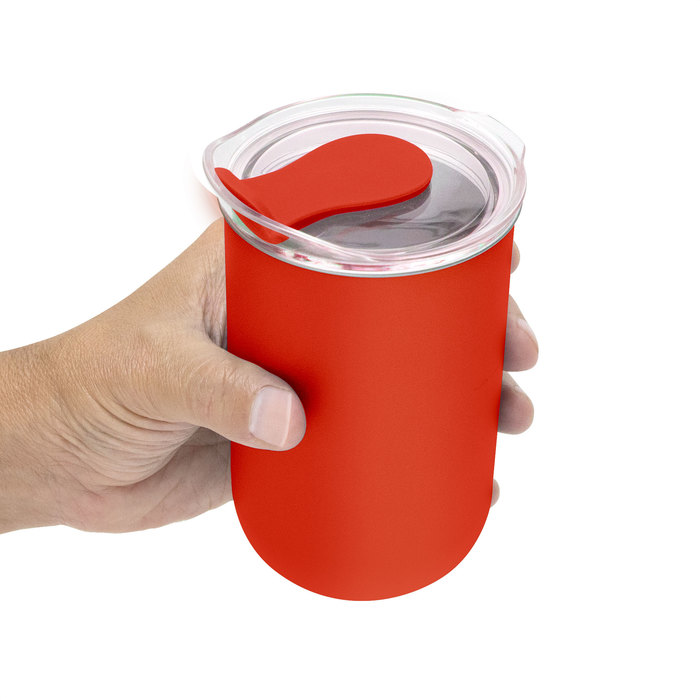 Mug "CAPSUL" Mug doble Pared. Interior de acero inoxidable 304 y exterior de polipropileno. Pintura acabado mate. Tapa plástica transparente a presión con anillo de silicona y cierre de silicona a tono con el color del cuerpo.