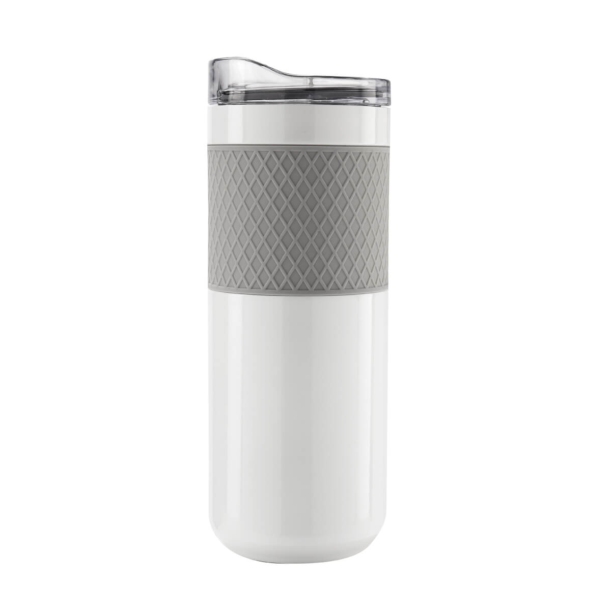 TERMO MOCHA - Doble pared. Cerrado al vacío. Pared interna y externa de acero inoxidable. Incluye tapa de plástico con cierre de rosca y válvula de seguridad. Banda de silicón texturizada antiderrapante. Mantiene temperatura caliente 6 hrs y temperatura fría 8 hrs.Incluye caja individual.