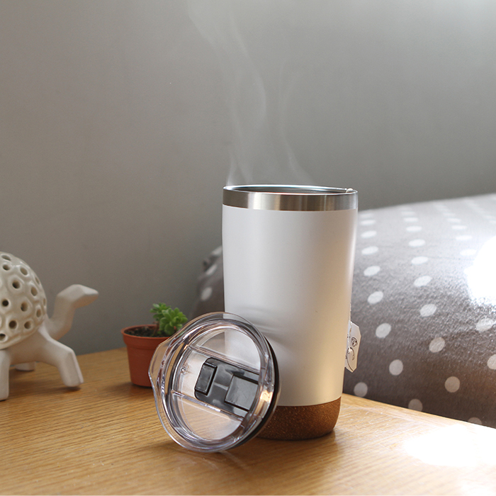 Vaso Cáceres. - Vaso de acero inoxidable doble pared con detalle tipo corcho en la base, fabricado en materiales de grado alimenticio, mantiene bebidas frías o calientes por un largo tiempo, no usar en microondas, capacidad de 470 ml (16 oz). Incluye caja de cartón individual.