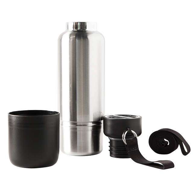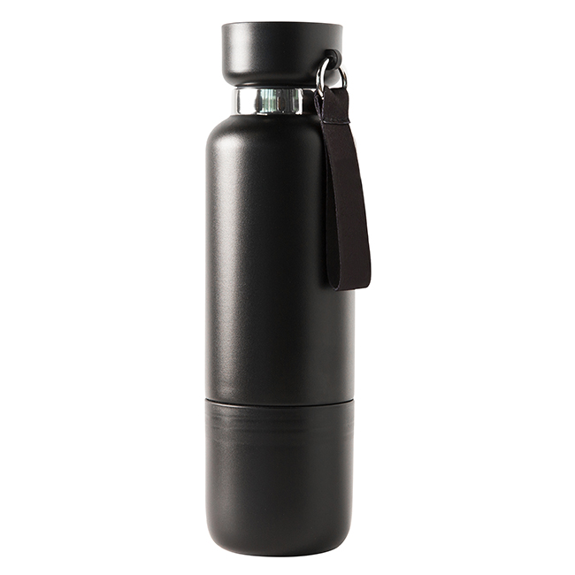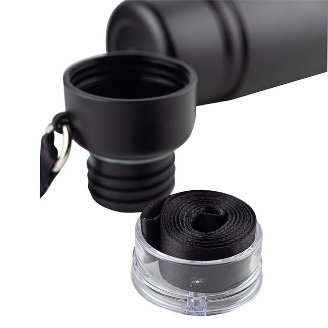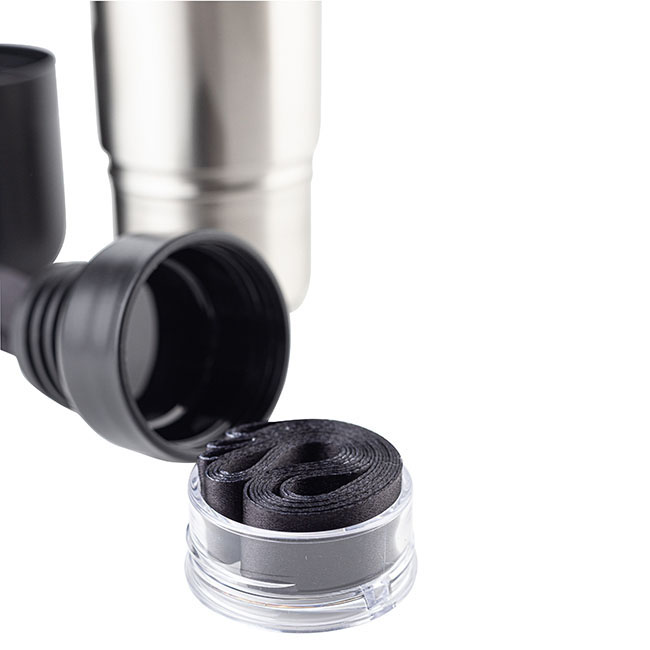 Termo Berza Termo Berza • Capacidad: 500 ml • Sistema de doble pared al vacío para conservar temperatura más tiempo • Tapa en rosca con cierre hermético y cavidad para almacenaje • Base removible que funciona como taza • Doble correa (larga y corta) con argolla tipo arnés para sujetar • Colores disponibles: Negro y Plata Material: Acero inoxidable Impresión: Full Color 360 Regular, Láser, Tampografía, Full Color 360 Manga
