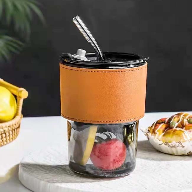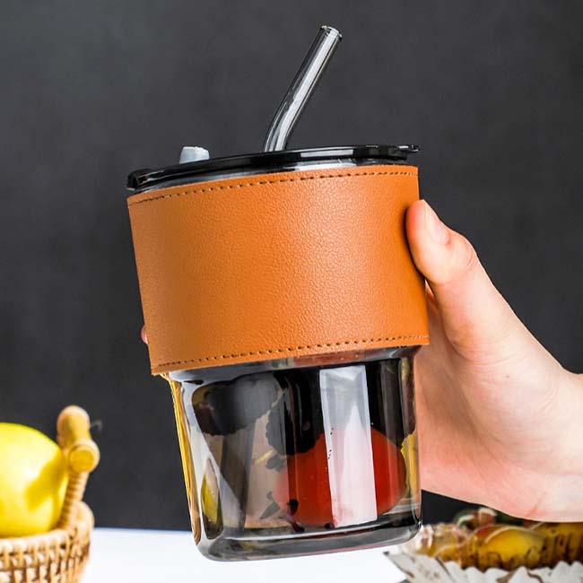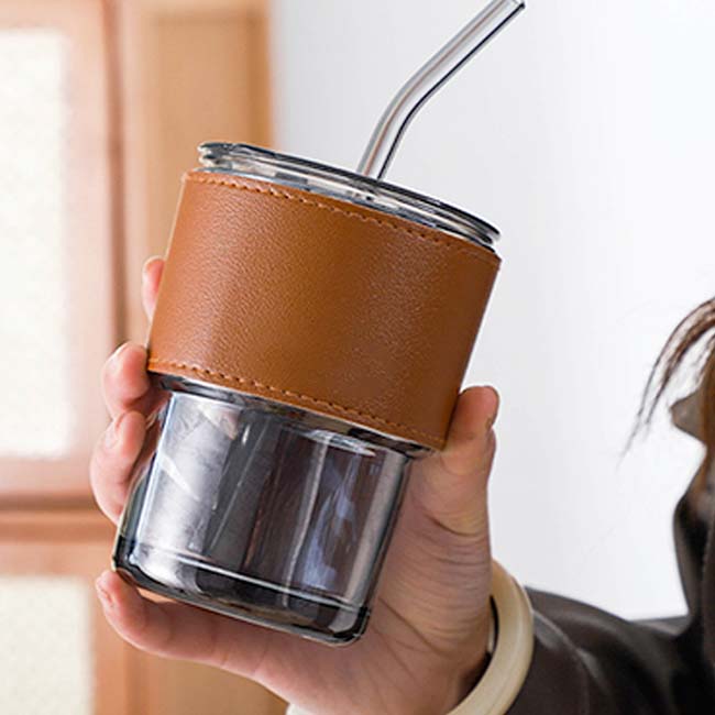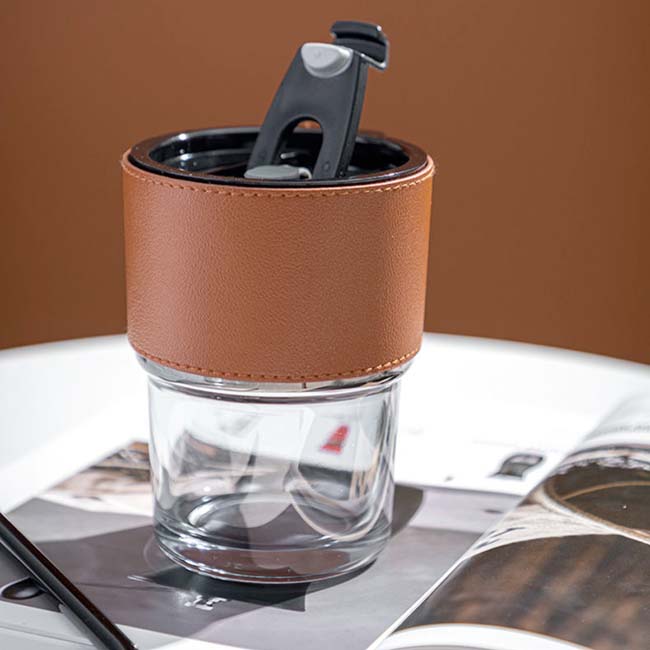 Vaso Capuchino Vaso Capuchino • Capacidad: 350 ml • Manga protectora en curpiel • Incluye popote • Tapa con lengüeta en cierre a presión • Disponible en color: Café Material: Vidrio Impresión: Láser, tampografía
